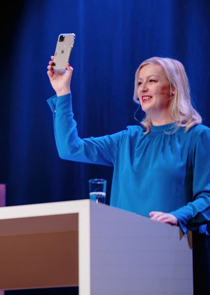 Carmen Hentschel versteht es, die Menschen einzubinden. Sie schafft überraschende Momente, lädt zum Ausprobieren ein und diskutiert mit Ihrem Publikum live vor Ort über ihre Erfahrungen mit KI.
